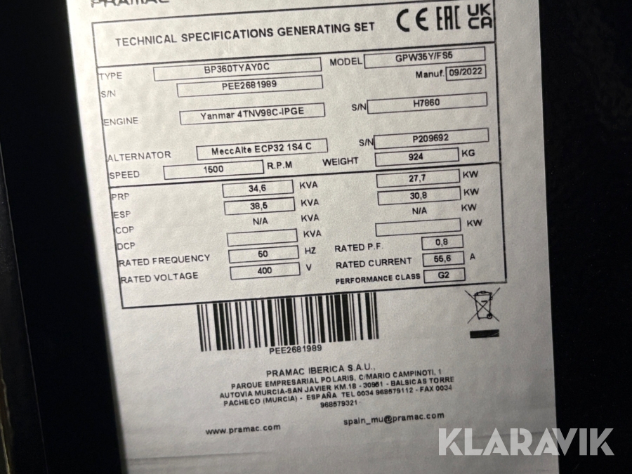 Elverk på kärra Pramac GWP35Y